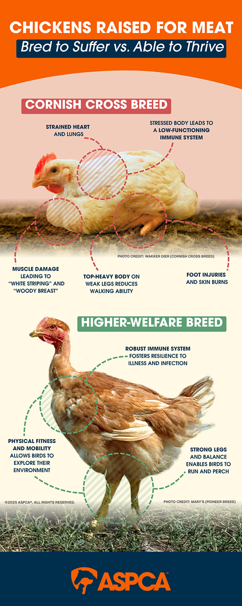 These nine billion Cornish Cross birds are bred to suffer, but there are alternative options for farmers and chicken producers to raise instead.