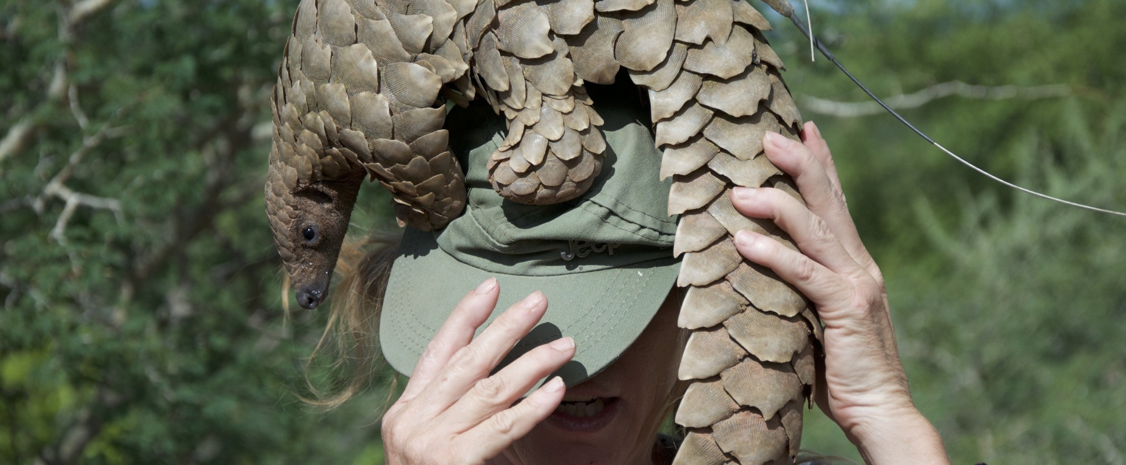 person with pangolin on head Namibia Africa