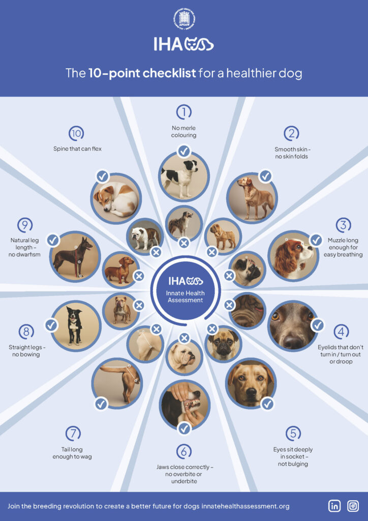 The IHA aims to solve the top conformation issues impacting dog welfare. 10 criteria which are easy to see and anyone can take the test. if the dog fails it should not be bred from and those looking to buy a puppy should avoid these 10 traits as well if they want a healthier dog and to try to avoid veterinary bills in the future.