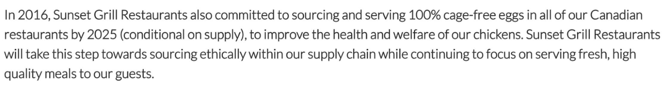 Similarly, Sunset Grill also abandoned its original timeline and weakened its stance on animal welfare by accepting enriched cages, and pushing its commitment deadline even further to 2036, a staggering 20 years after the company first promised to spare hens from cages.