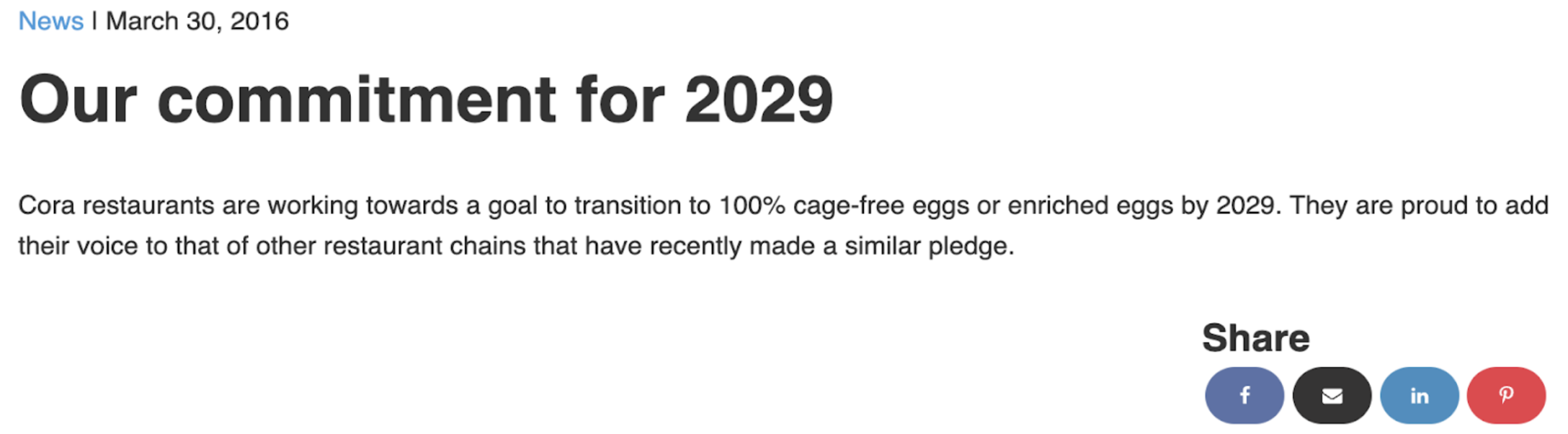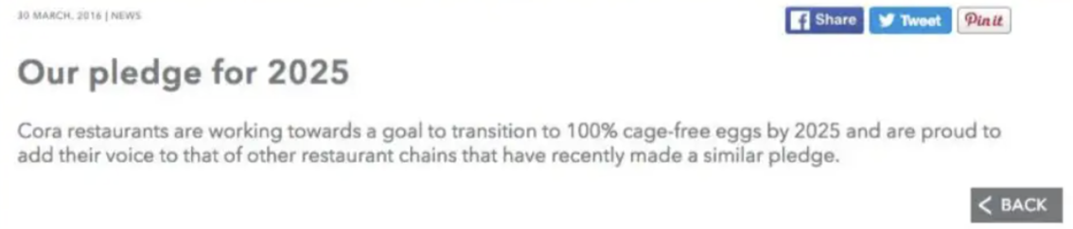 After years of silence on their progress, Cora delayed their 2025 commitment deadline to 2029. In a troubling attempt to rewrite history, the company appears to have edited its original 2016 press release, retroactively changing the 2025 date to 2029 and adding “enriched cages” (cages only slightly larger than standard cages) as if that had been the plan all along.